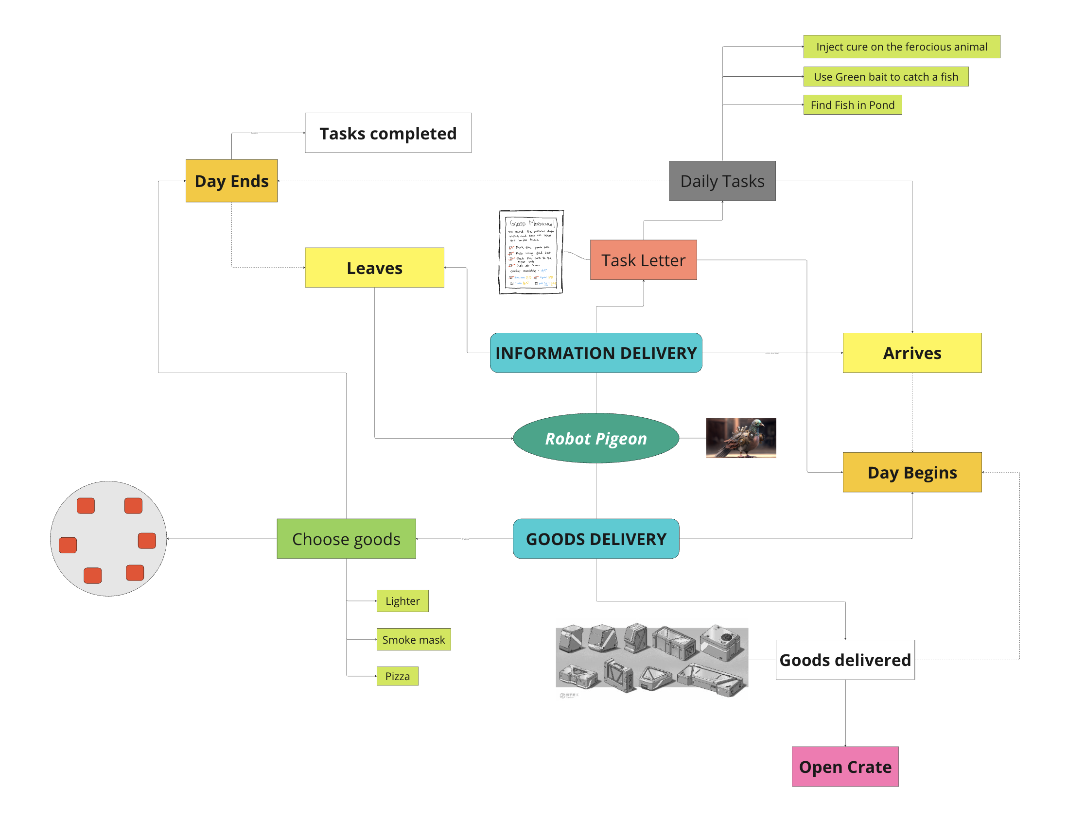 The task for the day comes in every morning and once you submit the completed task form to the Pigeon, he will take it back and return the next day with the attained credits from the tasks.